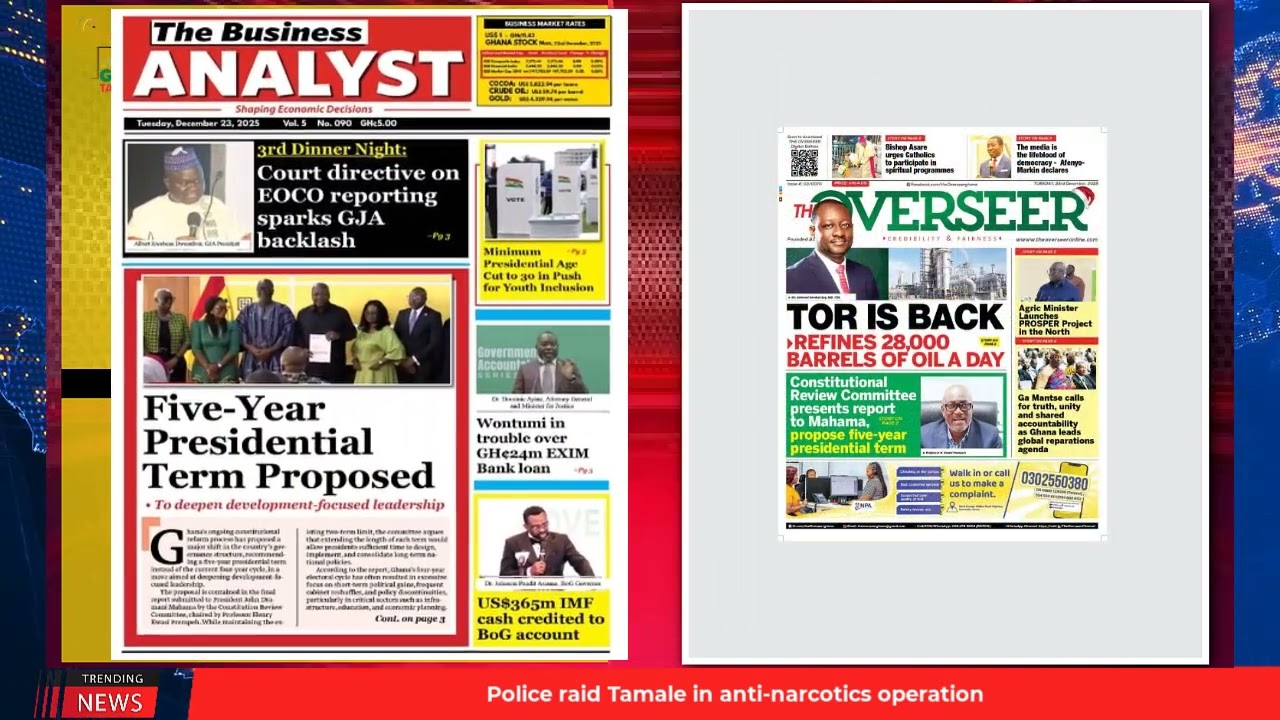 NewsGhana Newspaper Ghana Newspaper Headlines: December 23, 2025; No 3rd term for presidents 23rd December 2025 0 2 Share Facebook Twitter WhatsApp Linkedin Pinterest Telegram Viber Cost of living is good under Mahama TOR is back… Minority slams Gov’t and MORE…