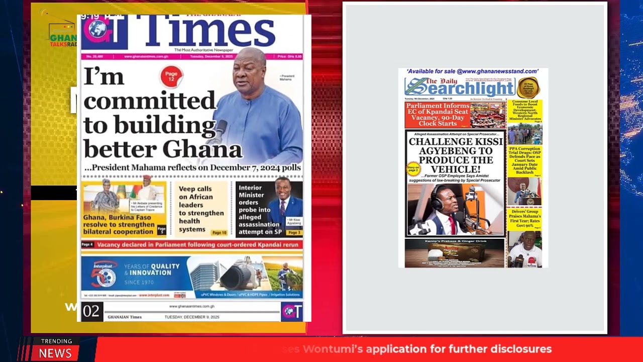 NewsGhana Newspaper Ghana Newspaper Headlines: December 9, 2025; Give Me Power, I’ll Give You Jobs – Ken Agyapong 9th December 2025 0 3 Share Facebook Twitter WhatsApp Linkedin Pinterest Telegram Viber Portable lab unveiled for basic schools Kufuor’s tough talk – NDC reacts NAIMOS’ Galamsey fight suffers major setbacks and MORE…