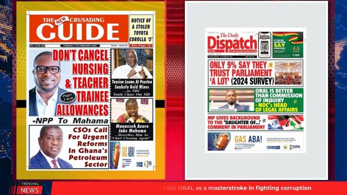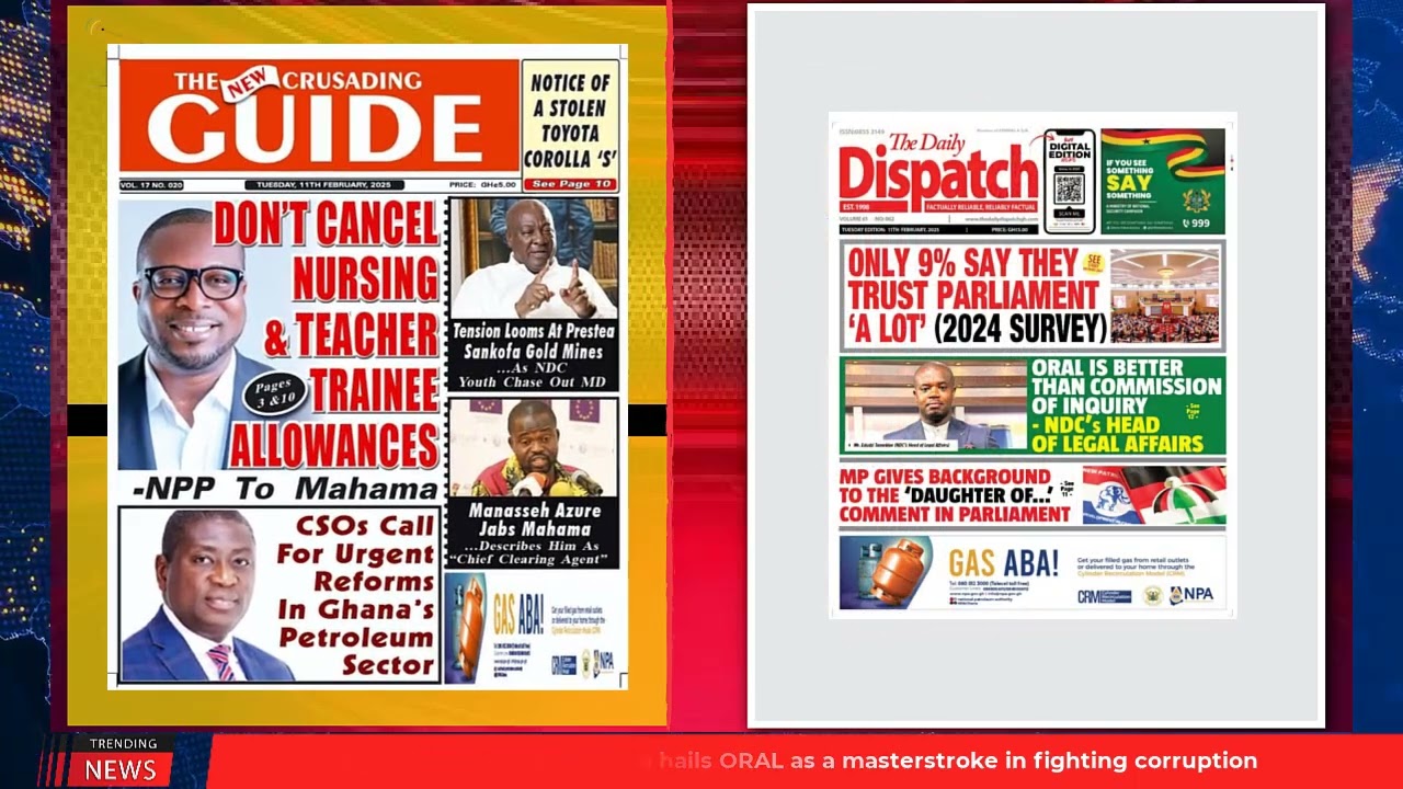 NewsGhana Newspaper Ghana Newspaper Headlines: Feb. 11, 2025; Commence immediate probe into ORAL report; Mahama orders Attorney General 11th February 2025 0 54 Share Facebook Twitter WhatsApp Linkedin Pinterest Telegram Viber Only 9% say they trust parliament a lot, 2024 survey Mahama snubs Bolga Adam Smith? His name still missing from list of Ministers Vetting Chaos, I take blame—Dafeamekpo and MORE…