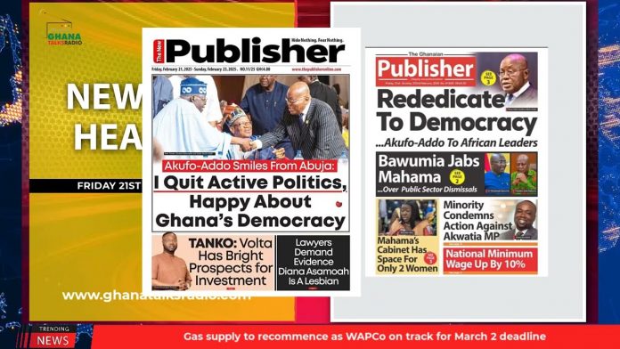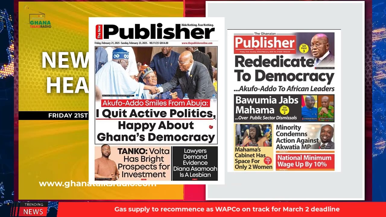 NewsGhana Newspaper Ghana Newspaper Headlines: Feb. 21, 2025; 10% pay rise to govt workers 21st February 2025 0 43 Share Facebook Twitter WhatsApp Linkedin Pinterest Telegram Viber Frimpong Boateng skins NDC’s lawyer Senanu NPP’s handling of the economy made Ghana a crime scene – Prez Rededicate to democracy, Akufo-Addo to African leaders and MORE…