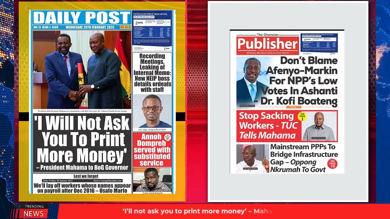 NewsGhana Newspaper Ghana Newspaper Headlines: Feb. 26, 2025; I will not ask you to print more money. President Mahama to BoG Governor 26th February 2025 0 61 Share Facebook Twitter WhatsApp Linkedin Pinterest Telegram Viber NPP would have gotten 30% if the Prez election was held in Aug. 2024—NPP Guru Strengthening education system: Bring back experimental schools, Dr Amattey advocates Don’t blame Afenyo Markin for NPP’s low votes in Ashanti, Dr. Kofi Boateng and MORE…