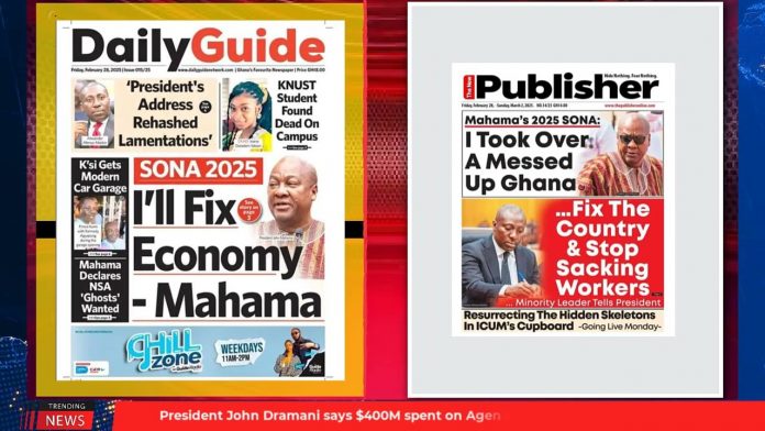 NewsGhana Newspaper Ghana Newspaper Headlines: Feb. 28, 2025; SONA 2025, I’ll fix economy – Mahama 28th February 2025 0 52 Share Facebook Twitter WhatsApp Linkedin Pinterest Telegram Viber Accra economic dialogue, All hands on deck, Mahama urges nation; says free SHS has come to stay GHS 22 billion needed to complete agenda 111—Mahama Mahama’s 2025 SONA; I took over a messed up Ghana and MORE…
