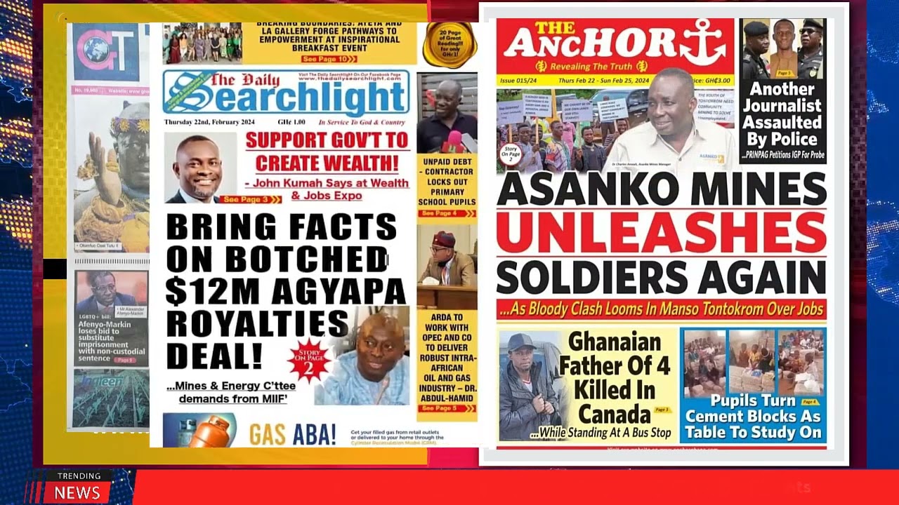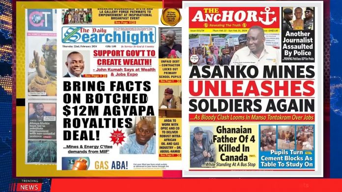 NewsGhana Newspaper Ghana Newspaper Headlines: February 22, 2024; Avoid Hate Speech 22nd February 2024 0 165 Share Facebook Twitter WhatsApp Linkedin Pinterest Telegram Viber -Political Parties Appoint Leadership -John Kumah Woos Private Sector -Asanko Mines Unleashes Soldiers Again -Avoid Hate Speech and MORE…
