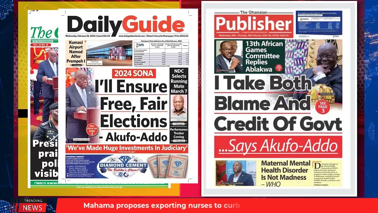 NewsGhana Newspaper Ghana Newspaper Headlines: February 28, 2024; I’m The Driver 28th February 2024 0 125 Share Facebook Twitter WhatsApp Linkedin Pinterest Telegram Viber -I’ll Ensure Free, Fair Elections – Akufo-Addo -I’ll Take Both Blame And Credit Of Govt – Akufo-Addo -Nana Forgets Huma Rights -I’m The Driver and MORE…