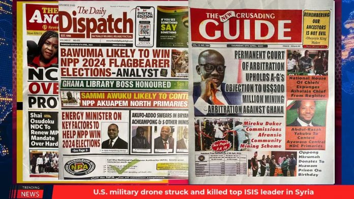 NewsGhana Newspaper Ghana Newspaper Headlines | GhanaTalksRadio.com | Apr 06 | 2023 6th April 2023 0 242 Share Facebook Twitter WhatsApp Linkedin Pinterest Telegram Viber Today’s Newspaper Headlines -Love, Forgiveness, Honesty Must Reign Supreme; Church Leaders To Ghanaians -NCE Boils Over ‘Missing’ Provident Fund -Bawumia Likely To Win NPP 2024 Flagbearer Elections- Analyst MORE…