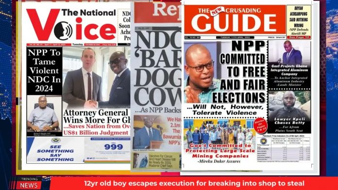 NewsGhana Newspaper Ghana Newspaper Headlines | GhanaTalksRadio.com | Apr 11 | 2023 11th April 2023 0 253 Share Facebook Twitter WhatsApp Linkedin Pinterest Telegram Viber Today’s Newspaper Headlines -NDC Accuses Keche’s Wife Of Forgery -Church Leaders Inspire Nation; Ressurection, Hope To Overcome Life’s Challenges -NDC ‘Baring Dogs’ Cowed As NPP Backs Bryan Acheampong MORE…