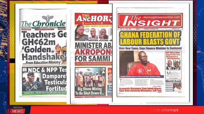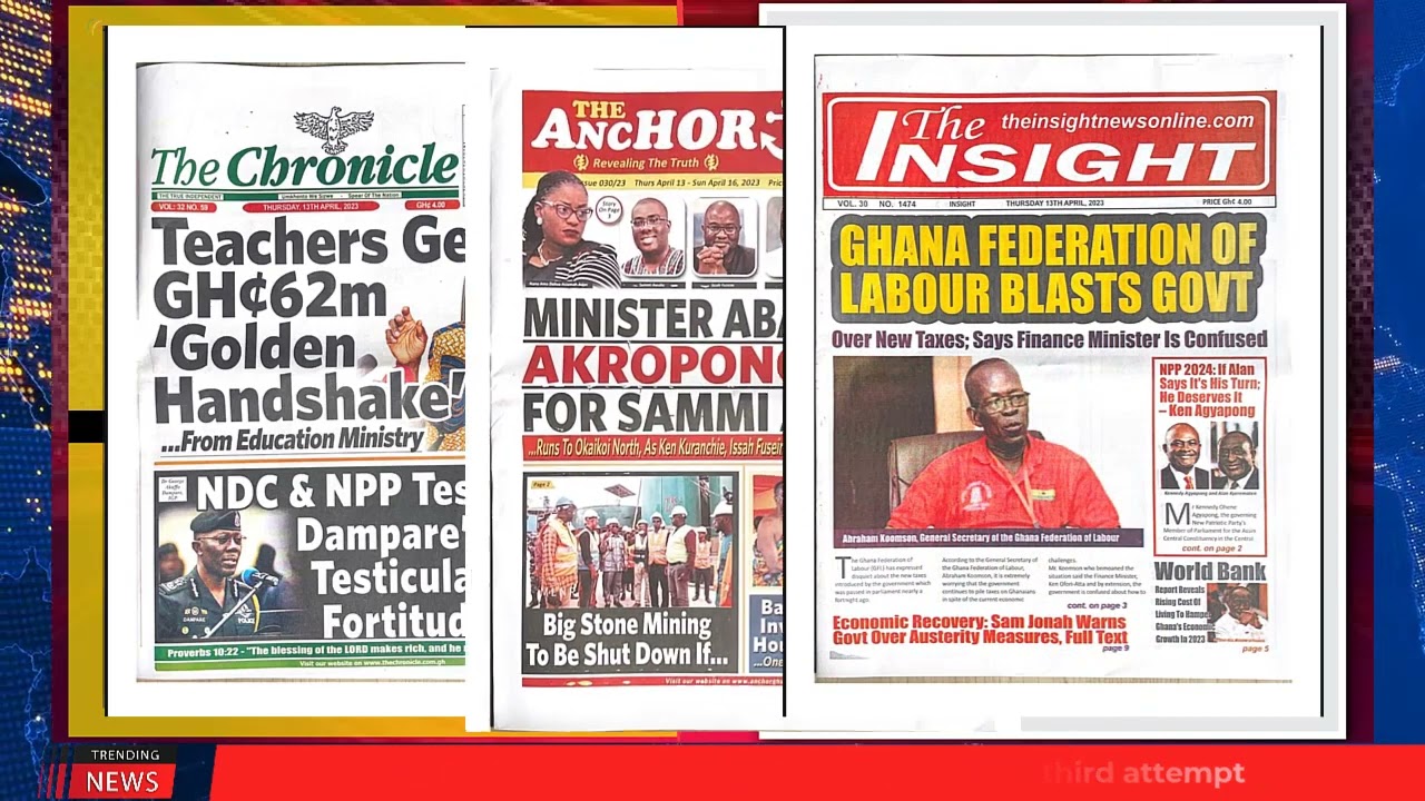 NewsGhana Newspaper Ghana Newspaper Headlines | GhanaTalksRadio.com | Apr 13 | 2023 13th April 2023 0 251 Share Facebook Twitter WhatsApp Linkedin Pinterest Telegram Viber Today’s Newspaper Headlines -Govt Throws Weight Behind ECG; Move Necessary For Defraying Debt Owed Power Generators -ORC ‘Blacklists 2812 Churches, Others; To Remove Names From Register Of Companies -University Don Lauds Education Reform MORE…