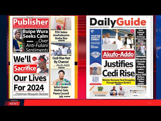 NewsGhana Newspaper Ghana Newspaper Headlines | GhanaTalksRadio.com | Dec 19 | 2022 19th December 2022 0 298 Share Facebook Twitter WhatsApp Linkedin Pinterest Telegram Viber Today’s Newspaper Headlines -‘War Lord’ Chairs Papa Jay’s NDC …As Braa Fotoo Fails To swat seen & noisy Mosquito -Five Killed At Bator By Suspected Hit Squad -We’ll Sacrifice Our Lives For 2024 …Chairman Mosquito Declares …MORE
