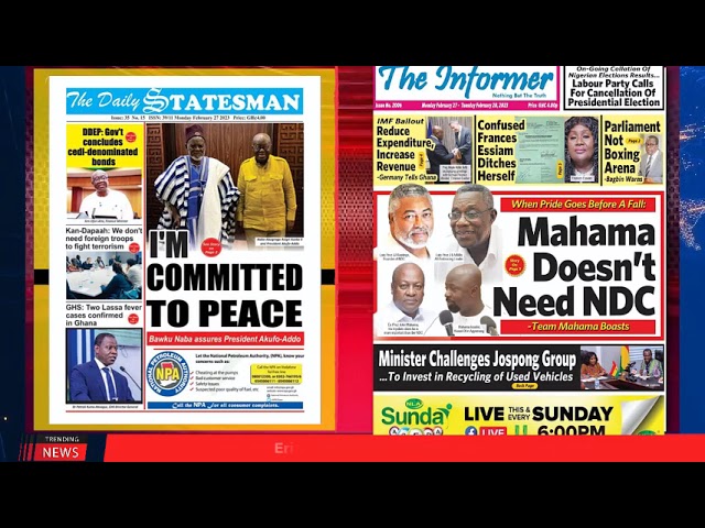NewsGhana Newspaper Ghana Newspaper Headlines | GhanaTalksRadio.com | Feb 27 | 2023 27th February 2023 0 230 Share Facebook Twitter WhatsApp Linkedin Pinterest Telegram Viber Today’s Newspaper Headlines -Illegal miners destroy rehabilitated farms -Mahama doesn’t need NDC, Team Mahama boasts -More fire on GRA boss over continuous stay at post MORE…