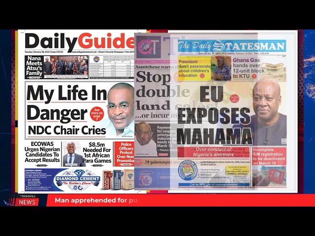 NewsGhana Newspaper Ghana Newspaper Headlines | GhanaTalksRadio.com | Feb 28 | 2023 28th February 2023 0 231 Share Facebook Twitter WhatsApp Linkedin Pinterest Telegram Viber Today’s Newspaper Headlines -100 nurses leave Pantang hospital -My life is in danger, NDC Chair cries -Stop double land sales! Or incur my wrath MORE…