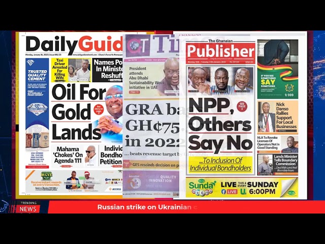 NewsGhana Newspaper Ghana Newspaper Headlines | GhanaTalksRadio.com | Jan 16 | 2023 16th January 2023 0 253 Share Facebook Twitter WhatsApp Linkedin Pinterest Telegram Viber Today’s Newspaper Headlines -Help us stabilise economy, Ken Ofori-Atta appeals to NPP leadership -GRA bags GH¢75bn in 2022, beats revenue target by GH¢3.6bn -NPP, others say no to inclusion of individual bondholders MORE…