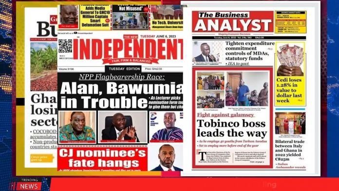 NewsGhana Newspaper Ghana Newspaper Headlines | GhanaTalksRadio.com | Jun 06 | 2023 6th June 2023 0 239 Share Facebook Twitter WhatsApp Linkedin Pinterest Telegram Viber Today’s Newspaper Headlines: -SIM Card Deactivation: Mobile Money Account Holders Cry OutI llegality -Anglo Mines Will Always Be Protected: Govt Will Not Condone -Ghana Risks Losing Cocoa Sector MORE…