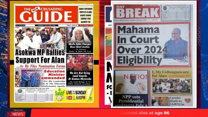 NewsGhana Newspaper Ghana Newspaper Headlines | GhanaTalksRadio.com | Jun 13 | 2023 13th June 2023 0 229 Share Facebook Twitter WhatsApp Linkedin Pinterest Telegram Viber -Mahama In Court Over 2024 Eligibility -Bring Honour to Judiciary -Asokwa MP Rallies Support For Alan MORE…