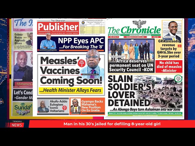 NewsGhana Newspaper Ghana Newspaper Headlines | GhanaTalksRadio.com | Mar 08 | 2023 8th March 2023 0 201 Share Facebook Twitter WhatsApp Linkedin Pinterest Telegram Viber -Military Swoops On Ashaiman, beats arrests over 72 residents for questioning -Govt Moves To Deliver Vaccines, Agyeman-Manu assures citizenry -Slain Soldier’s Lover Detained as Abongo boys turn Ashaiman into war zone MORE…