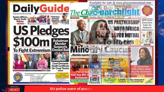 NewsGhana Newspaper Ghana Newspaper Headlines | GhanaTalksRadio.com | Mar 28 | 2023 28th March 2023 0 377 Share Facebook Twitter WhatsApp Linkedin Pinterest Telegram Viber Today’s Newspaper Headlines -US Pushes For Ghana’s Debt Reduction -US To Engage Ghana’s Creditors -US Partnership With Africa For Mutual Benefits-Harris MORE…