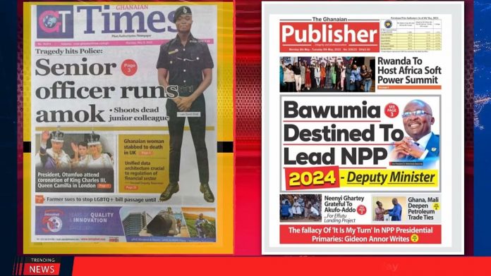 NewsGhana Newspaper Ghana Newspaper Headlines | GhanaTalksRadio.com | May 08 | 2023 8th May 2023 0 222 Share Facebook Twitter WhatsApp Linkedin Pinterest Telegram Viber Today’s Newspaper Headlines: -Bawumia Destined To Lead NPP 2024 -Suspected Killers Of GPHA Boss Grabbed! -Senior Officer Runs Amok; Shoots Dead Junior Colleague MORE…