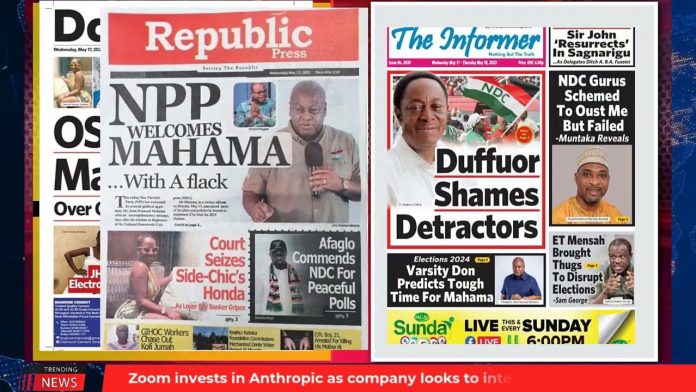 NewsGhana Newspaper Ghana Newspaper Headlines | GhanaTalksRadio.com | May 17 | 2023 17th May 2023 0 241 Share Facebook Twitter WhatsApp Linkedin Pinterest Telegram Viber Today’s Newspaper Headlines: John Mahama Chapter 2: 60 Ministers, No Ex-Gratia -Duffuor Shames Detractors -NPP Welcomes Mahama With A Flack MORE…