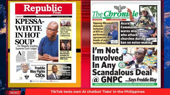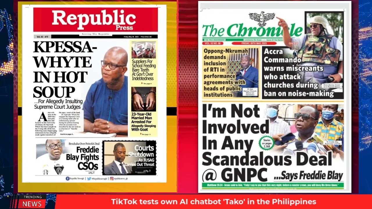 NewsGhana Newspaper Ghana Newspaper Headlines | GhanaTalksRadio.com | May 26 | 2023 26th May 2023 0 302 Share Facebook Twitter WhatsApp Linkedin Pinterest Telegram Viber Today’s Newspaper Headlines: I’m not involved in Any Scandalous Deal At GNPC – Freddie Blay -Kpessa Whyte In Hot Soup For Allegedly Insulting Supreme Court Judges -SHS Food Suppliers Demand Payment Finance Ministry Arranges GHC275m Arrear MORE…