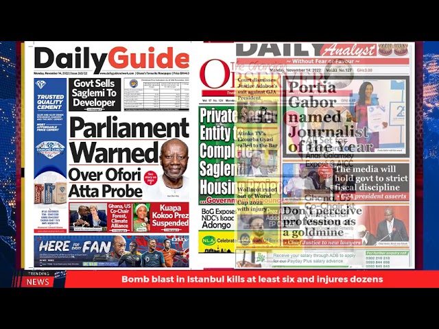 NewsGhana Newspaper Ghana Newspaper Headlines | GhanaTalksRadio.com | Nov 14 | 2022 14th November 2022 0 275 Share Facebook Twitter WhatsApp Linkedin Pinterest Telegram Viber Today’s Newspaper Headlines Ningo Ritual Killers Arrested …Human Head Exhumed Child Rights Sues Teacher Unions …Over Strike Parliament Warned Over Ofori-Atta Probe Private Sector Entity To Complete Saglemi Housing Project …Government Announces