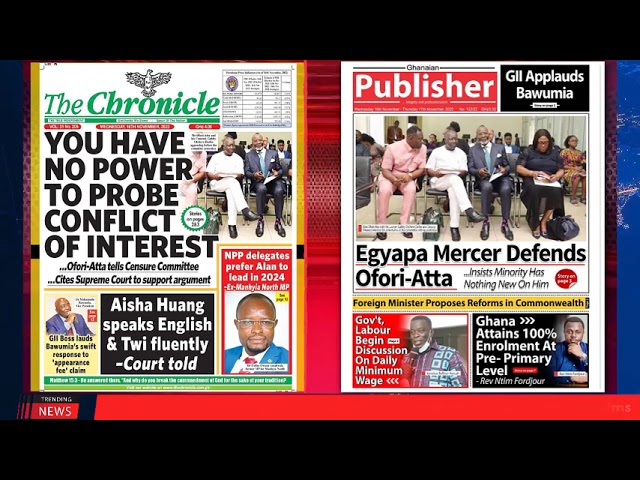 NewsGhana Newspaper Ghana Newspaper Headlines | GhanaTalksRadio.com | Nov 16 | 2022 16th November 2022 0 306 Share Facebook Twitter WhatsApp Linkedin Pinterest Telegram Viber Today’s Newspaper Headlines Ofori-Atta C’ttee Split Over “Ambush” Evidence You Have No Power To Probe Conflict Of Interest … Ofori-Atta Tells Censure Committee Agyapa Mercer Defends Ofori-Atta …Insists Minority Has Nothing New On Him MORE…