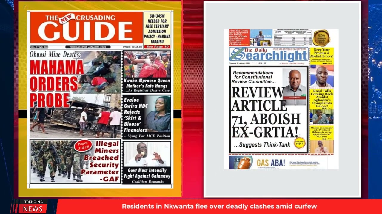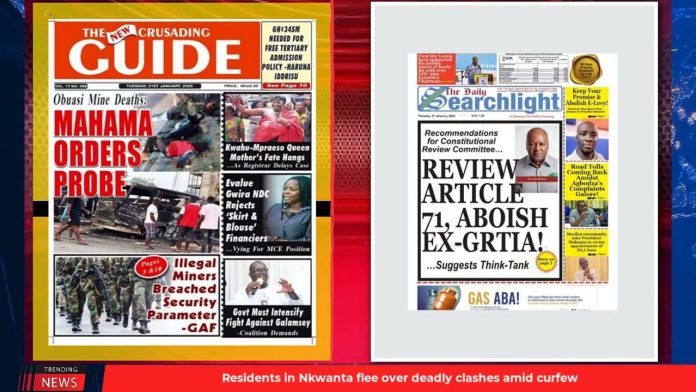 NewsGhana Newspaper Ghana Newspaper Headlines: Jan. 21, 2025; NPP will definitely present Bawumia for 2028 – NPP MP 21st January 2025 0 39 Share Facebook Twitter WhatsApp Linkedin Pinterest Telegram Viber Obuasi mine deaths: Mahama orders probe President Mahama makes new appointments to the Presidency Ghc135bn debt hangs over road sector, Minister designate reveals and MORE…