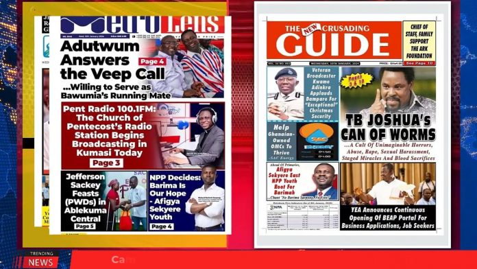 NewsGhana Newspaper Ghana Newspaper Headlines | January 10 | 2024; TB Joshua’s Can Of Worms 10th January 2024 0 109 Share Facebook Twitter WhatsApp Linkedin Pinterest Telegram Viber -Demand Solutions From Parties -Adutwum Answers The Veep Call -Our Victory Is Guaranteed -TB Joshua’s Can Of Worms and MORE…