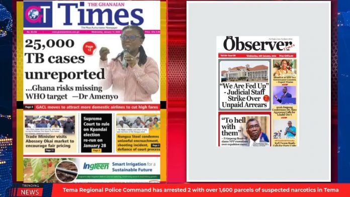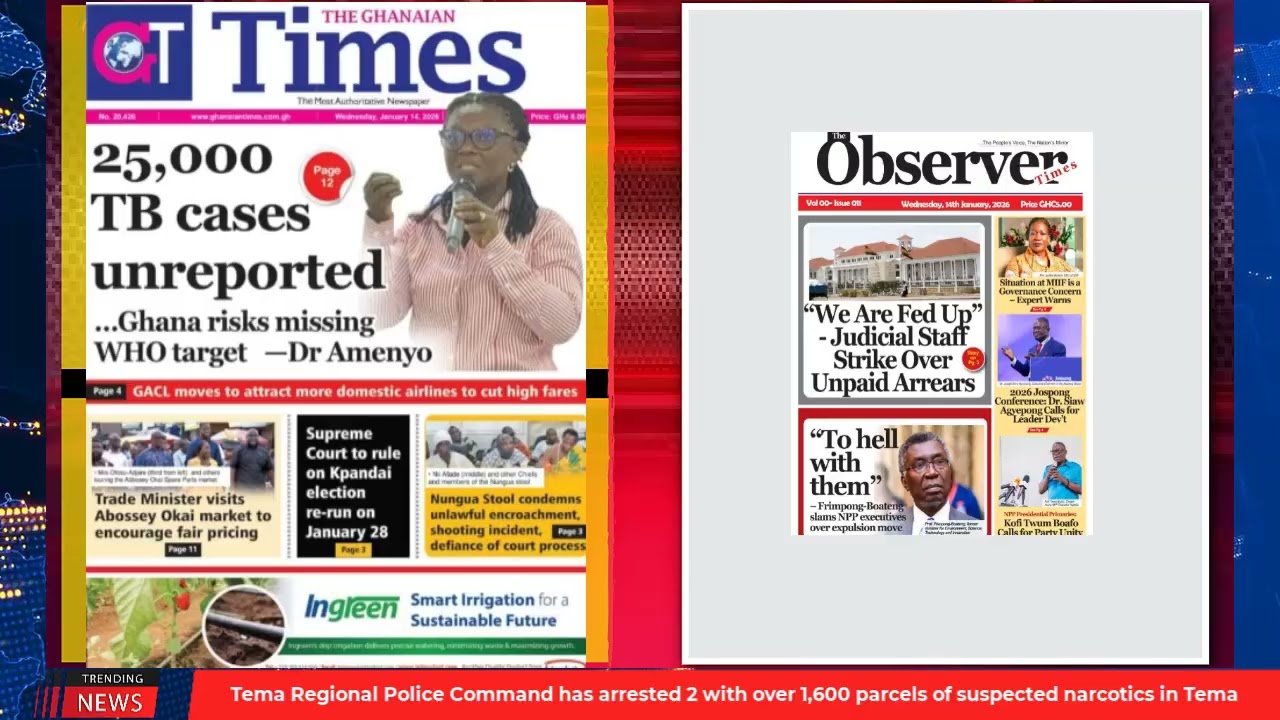 NewsGhana Newspaper Ghana Newspaper Headlines: January 14, 2026; Ofori-Atta Faces Immigration Judge Jan. 20 14th January 2026 0 3 Share Facebook Twitter WhatsApp Linkedin Pinterest Telegram Viber Who is behind GRA’s GH¢17m sweet oil deal? NPP to sack traitors 25,000 TB cases unreported and MORE…