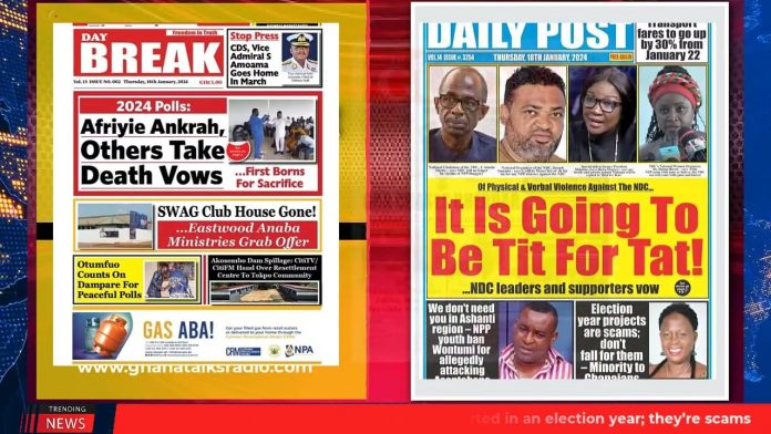 NewsGhana Newspaper Ghana Newspaper Headlines | January 18 | 2024; 8-Year-Old Ghosts Receive LEAP 18th January 2024 0 140 Share Facebook Twitter WhatsApp Linkedin Pinterest Telegram Viber -GRA Chases Cheddar -Afriyie Ankrah, Others Take Death Vows -Crisis Looms In Prisons Nationwide -8-Year-Old Ghosts Receive LEAP and MORE…