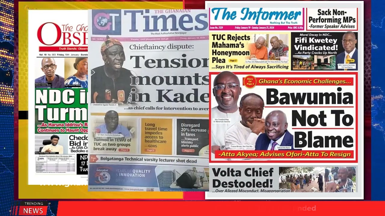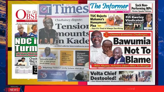 NewsGhana Newspaper Ghana Newspaper Headlines | January 19 | 2024; Bawumia Not To Blame 19th January 2024 0 138 Share Facebook Twitter WhatsApp Linkedin Pinterest Telegram Viber -Wontumi’s Blooper Riles Ashanti Youth -Stop Giving Tv, Radio Frequencies -Chieftaincy Dispute: Tension Mounts In Kade -Bawumia Not To Blame and MORE…