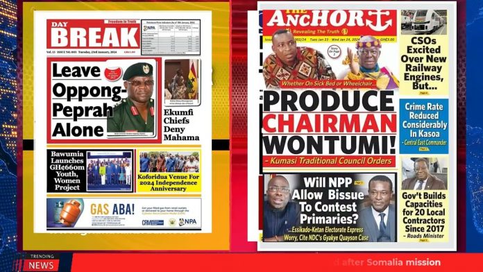 NewsGhana Newspaper Ghana Newspaper Headlines | January 23 | 2024; Produce Chairman Wontumi 23rd January 2024 0 125 Share Facebook Twitter WhatsApp Linkedin Pinterest Telegram Viber -NDC Declare War On Western Togoland -250,000 Young People Get GHc660m -Leave Oppong-Peprah Alone -Produce Chairman Wontumi and MORE…