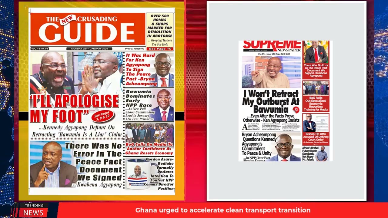 NewsGhana Newspaper Ghana Newspaper Headlines: January 26, 2026; GHS Car Caught Hauling ‘Bonsam Tawa’ 26th January 2026 0 4 Share Facebook Twitter WhatsApp Linkedin Pinterest Telegram Viber Polls Tip Bawumia To Win NPP Race Ashanti NPP rallies behind Bryan I won’t retract my outburst at Bawumia and MORE…
