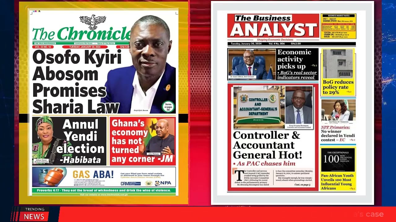 NewsGhana Newspaper Ghana Newspaper Headlines | January 30 | 2024; 12 Jailed For Life 30th January 2024 0 159 Share Facebook Twitter WhatsApp Linkedin Pinterest Telegram Viber -Women Representation Suffers Further Setback -Stay Focused ‘To Break The 8’ -Osofo Kyiri Abosom Prokises Sharia Law -12 Jailed For Life and MORE…