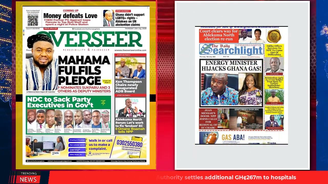 NewsGhana Newspaper Ghana Newspaper Headlines: July 10, 2025; Energy Minister hijacks Ghana gas 10th July 2025 0 79 Share Facebook Twitter WhatsApp Linkedin Pinterest Telegram Viber Mahama fulfills pledge, nominates Sukparu and 3 others as deputy ministers How Adidome ritual killing was plotted and executed Ablekuma North Election re-run: courts rejects injunction against EC and MORE…