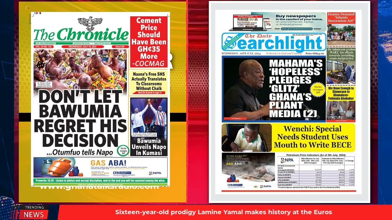 NewsGhana Newspaper Ghana Newspaper Headlines: July 10th, 2024; Eleven CSOs Rubbish Napo! 10th July 2024 0 83 Share Facebook Twitter WhatsApp Linkedin Pinterest Telegram Viber -Go And Serve Bawumia In Humility -Don’t Let Bawumia Regret His Decision -Bawumia, Napo Shake Kumasi and MORE…