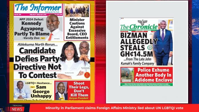 NewsGhana Newspaper Ghana Newspaper Headlines: July 11, 2025; “I am contesting today” 11th July 2025 0 33 Share Facebook Twitter WhatsApp Linkedin Pinterest Telegram Viber Bizman allegedly steals GH₵14.5m from the late John Kumah’s family company Ablekuma North Re-run: NPP, NDC Slug It Out Ablekuma North re-run: Candidate Defies Party Directive Not To Contest and MORE…