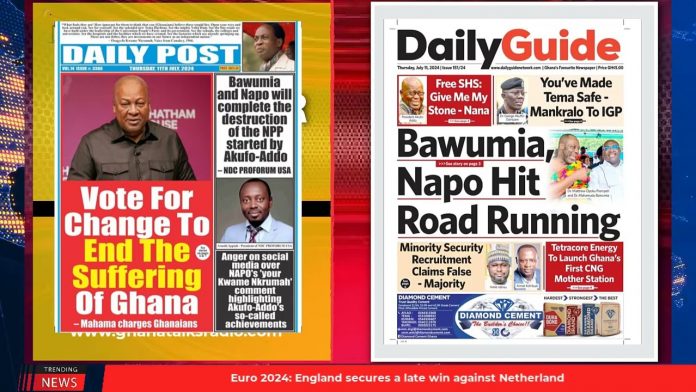 NewsGhana Newspaper Ghana Newspaper Headlines: July 11th, 2024; Bawumia, Napo In Full Flight 11th July 2024 0 89 Share Facebook Twitter WhatsApp Linkedin Pinterest Telegram Viber -Attack On Nkrumah Shows Napo’s True Colours – Nana Ohene Ntow -Bawumia, Napo Hit Road Running -Vote For Change To End The Suffering Of Ghana and MORE…