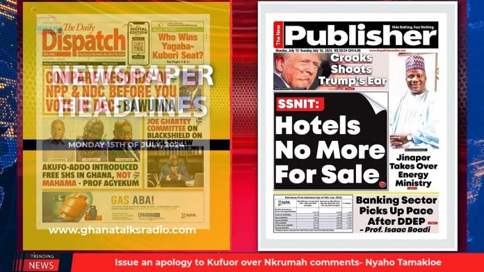 NewsGhana Newspaper Ghana Newspaper Headlines: July 15th, 2024; SSNIT Hotels No More For Sale 15th July 2024 0 90 Share Facebook Twitter WhatsApp Linkedin Pinterest Telegram Viber -Ya Na Praises Bawumia For Clean Campaign -Let’s Fight Fake News -Compare Records Of NPP & NDC Before You Vote In Dec and MORE…