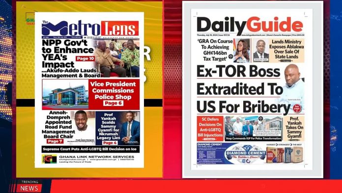 NewsGhana Newspaper Ghana Newspaper Headlines: July 18th, 2024; Ex-TOR Boss Extradited To US For Bribery 18th July 2024 0 90 Share Facebook Twitter WhatsApp Linkedin Pinterest Telegram Viber -100,000 Youth Gain Jobs Under My Administration – Akufo-Addo -We Will Continue To Expand YEA -GRA Bags GHc68bn In 6 Months and MORE…