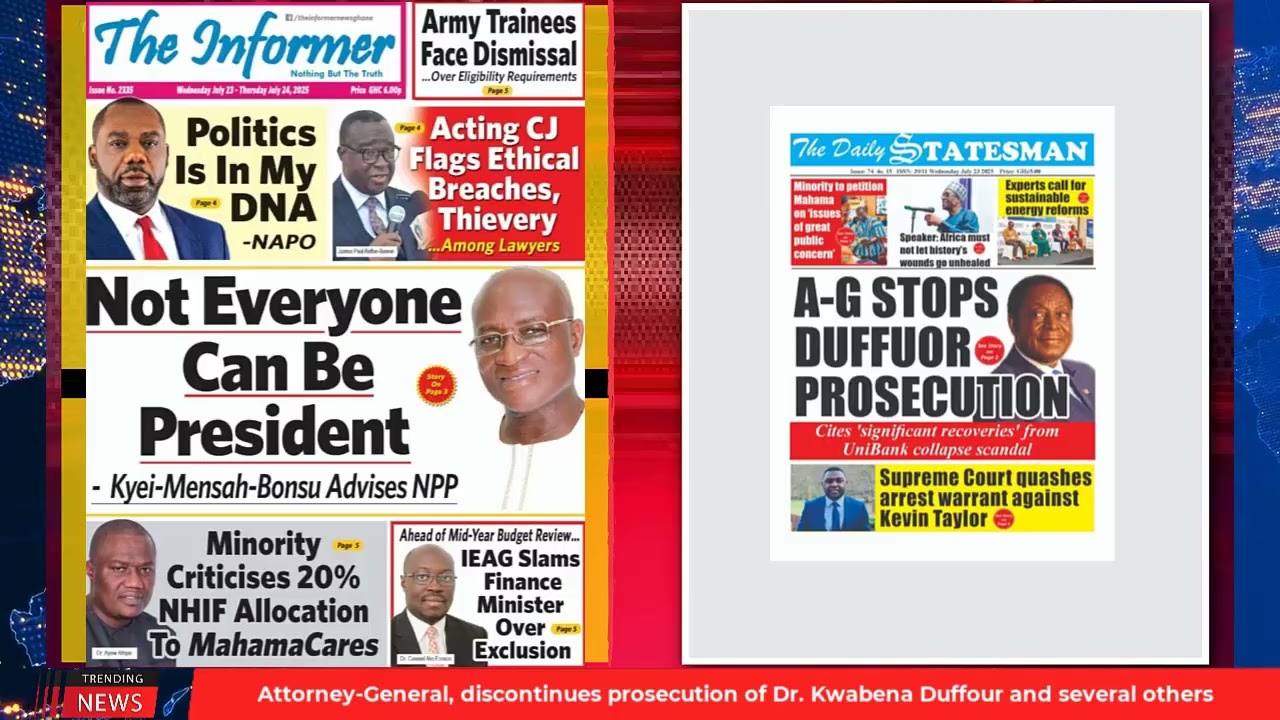 NewsGhana Newspaper Ghana Newspaper Headlines: July 23, 2025; Armed Forces Ammunition Missing 23rd July 2025 0 90 Share Facebook Twitter WhatsApp Linkedin Pinterest Telegram Viber Police Gun Down Robbers At Cantonments In Accra ECG Bleeds Billions AG Frees Kwabena Duffuor and MORE…