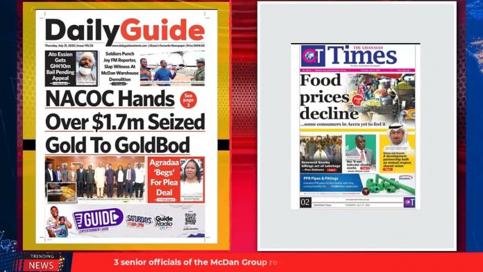 NewsGhana Newspaper Ghana Newspaper Headlines: July 31, 2025; Adutwum Is The Best Candidate For NPP – Odike 31st July 2025 0 81 Share Facebook Twitter WhatsApp Linkedin Pinterest Telegram Viber Food Prices Decline… NACOC Hands Over $1.7m Seized Gold To GoldBod Bawku Violence Deliberate… and MORE…