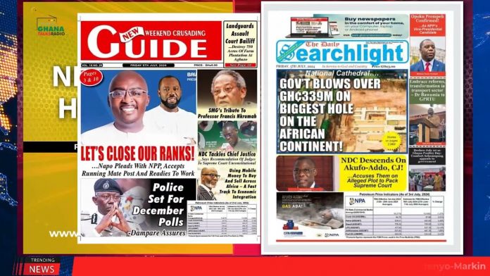 NewsGhana Newspaper Ghana Newspaper Headlines: July 5th, 2024; Let’s Close Our Ranks! 5th July 2024 0 79 Share Facebook Twitter WhatsApp Linkedin Pinterest Telegram Viber -I’ll Help Bawumia Break ‘The 8’ -NPP Okays Napo For Running Mate -Afenyo-Markin Cautions Politicians and MORE…