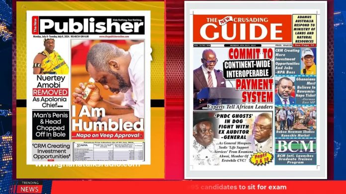 NewsGhana Newspaper Ghana Newspaper Headlines: July 8th, 2024; I’m Humbled – Napo On Veep Approval 8th July 2024 0 98 Share Facebook Twitter WhatsApp Linkedin Pinterest Telegram Viber -‘The NAPO I Know: Portrait Of A Confident Leader And Mentor’ -Naa Torshie Endorses Bawumia-NAPO Ticket -Supreme Court At Breaking Point and MORE…