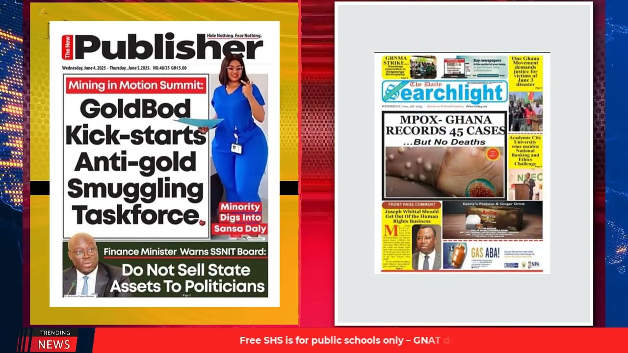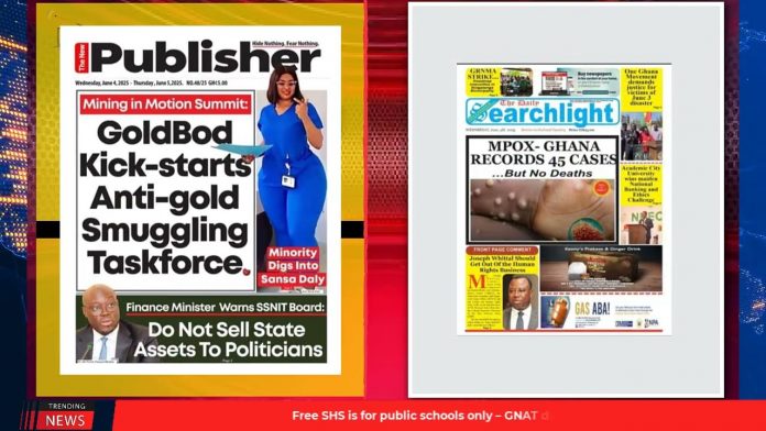 NewsGhana Newspaper Ghana Newspaper Headlines: June 4, 2025; GOLDBOD’s historic feat, ASM Gold exports hit $4b 4th June 2025 0 33 Share Facebook Twitter WhatsApp Linkedin Pinterest Telegram Viber I’m honoured to end 40 years diplomatic service here. Virginia Palmer MPOX: Ghana records 45 cases but no deaths I don’t care whose OX is gored