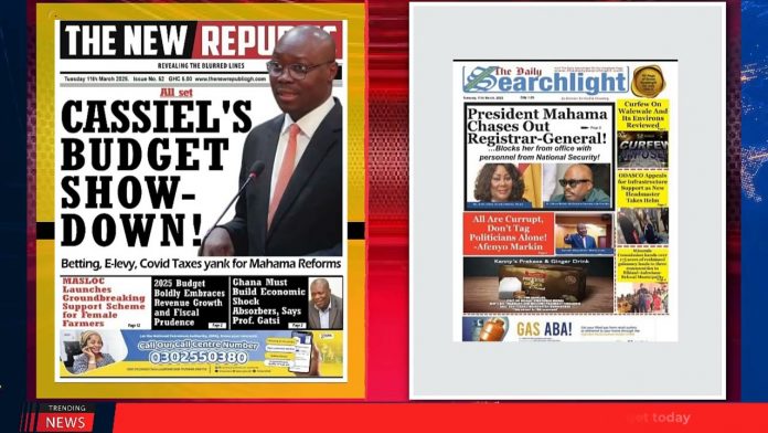 NewsGhana Newspaper Ghana Newspaper Headlines: March 11, 2025; Finance Minister to scrap e-levy, COVID tax in 2025 budget 11th March 2025 0 130 Share Facebook Twitter WhatsApp Linkedin Pinterest Telegram Viber Jailed for nothing, man locked up for 19 years over bungled trial Stop galamsey, In the name of Ghana and God, Omane Boamah warns Food alert: Most processed tomato impure, nutritionists reveals and MORE…
