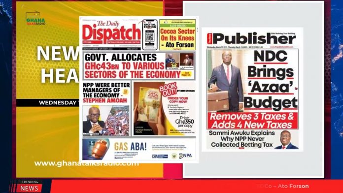 NewsGhana Newspaper Ghana Newspaper Headlines: March 12, 2025; Govt allocates Gov 44.17bn for key initiatives 12th March 2025 0 152 Share Facebook Twitter WhatsApp Linkedin Pinterest Telegram Viber Ato Forson unveils Mahama’s bold budget to revive Ghana’s economy NDC brings azaa budget, removes 3 taxes and adds 4 new taxes Economy grew by 5.7% to Gh₵1.17 trillion; debt to GDP now 61.8% under NPP and MORE…
