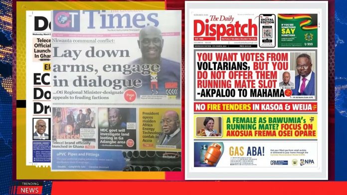 NewsGhana Newspaper Ghana Newspaper Headlines: March 13, 2024; Floods Imminent This Year 13th March 2024 0 113 Share Facebook Twitter WhatsApp Linkedin Pinterest Telegram Viber -Will Bawumia Also Pick a Woman? -EC ‘Shoots Down’ NDC Drone Operation -EC Warns NDC: Sorry, You can’t Fly Your Drones On Election Day -Floods Imminent This Year and MORE…