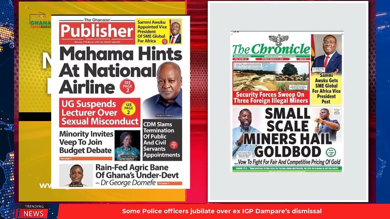 NewsGhana Newspaper Ghana Newspaper Headlines: March 17, 2025; Ofori Atta sues OSP over fugitive tag 17th March 2025 0 133 Share Facebook Twitter WhatsApp Linkedin Pinterest Telegram Viber Mahama hints at National airline Small scale miners hail GOLDBOD, Vow to fight for fair and competitive pricing of Gold I will work with utmost seriousness, the new IGP assures and MORE…