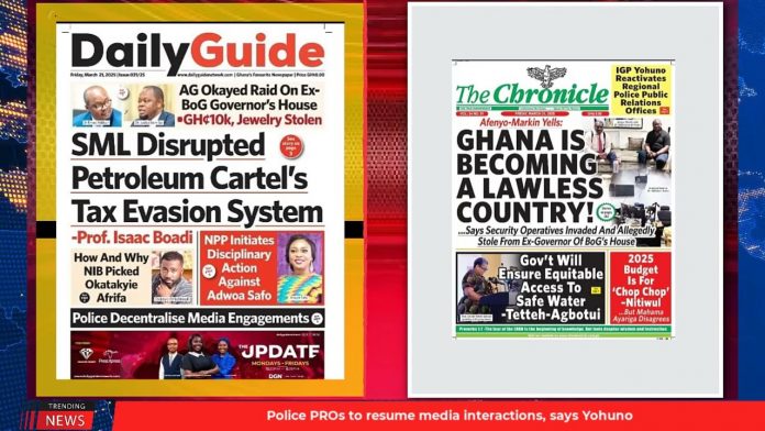 NewsGhana Newspaper Ghana Newspaper Headlines: March 21, 2025; Stop your hawks now, Afenyo Markin tells Mahama 21st March 2025 0 171 Share Facebook Twitter WhatsApp Linkedin Pinterest Telegram Viber Burn galamsey excavators, activists advocates Govt to set up mining operatives to replace community mining schemes Cholera kills 19 in central region; 3000 suspected cases recorded and MORE…