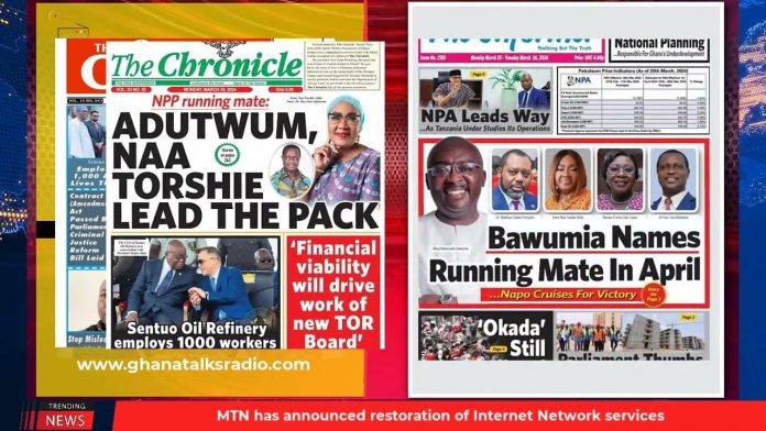 NewsGhana Newspaper Ghana Newspaper Headlines: March 25, 2024; Pres. Assents To Contracts Bill 25th March 2024 0 131 Share Facebook Twitter WhatsApp Linkedin Pinterest Telegram Viber -NPP Running Mate: Adutwum, Naa Torshie Lead The Pack -Kweshi Ahwoi Sparks Outrage In NDC -President Hails African Games Success!!! -Pres. Assents To Contracts Bill and MORE…