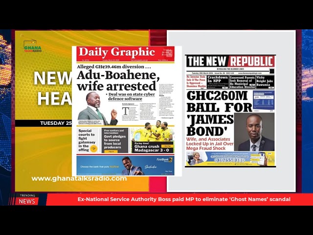 NewsGhana Newspaper Ghana Newspaper Headlines: March 25, 2025; AG Corruption expose: Ex-NSB Boss, wife detained over Gh39.46m theft, face up to 25 years in prison 25th March 2025 0 138 Share Facebook Twitter WhatsApp Linkedin Pinterest Telegram Viber Cyber defence system case, Adu Boahen is a high flight risk; AG Ayine directs EOCO to release and re-arrest him GOLDBOD to inject Gh₵250m weekly into Ghana’s economy- Sammy Gyamfi AG fights NPP Appointees over alleged corruption cases and MORE…